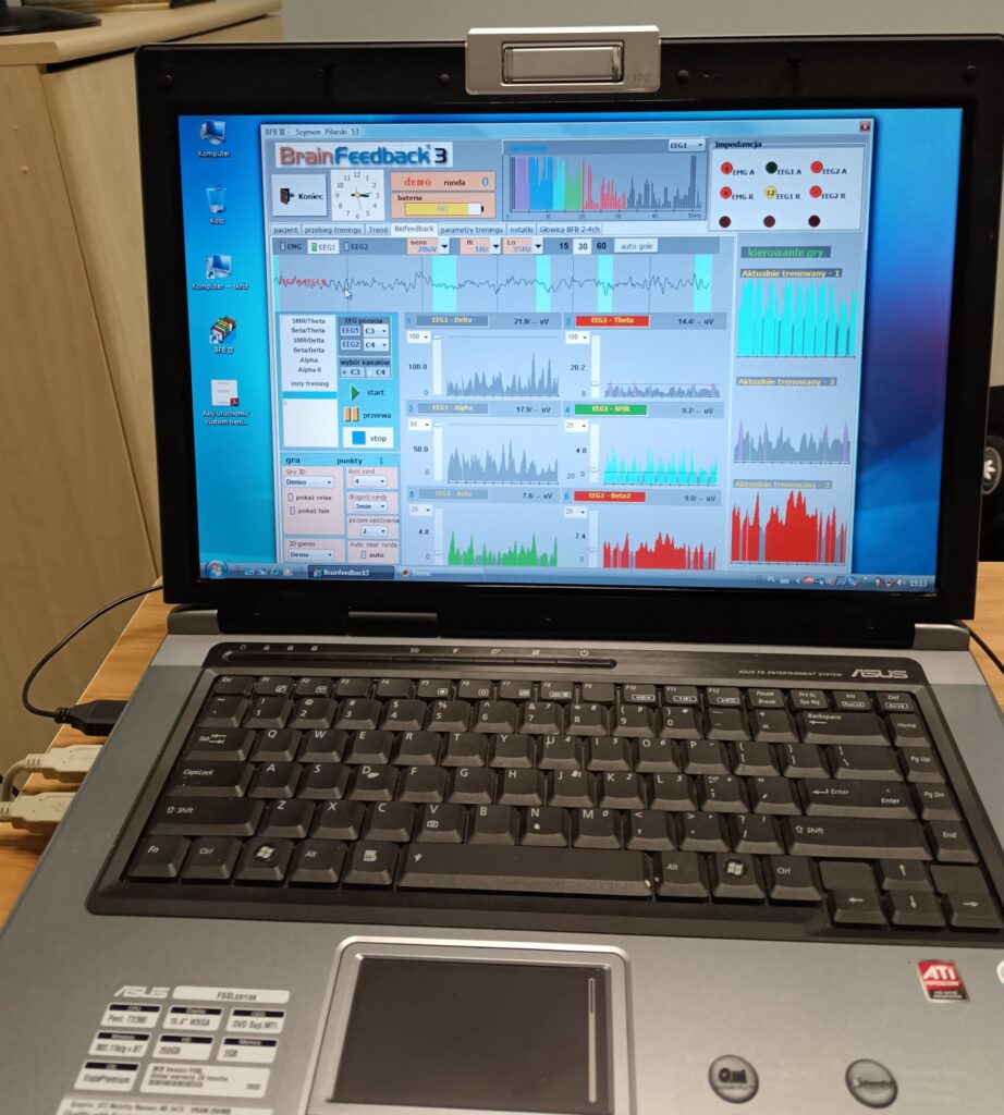 Osoba trenująca ma podłączone do powierzchni głowy i przypięte do uszu elektrody przekazujące sygnały z mózgu do monitora terapeuty, na którym widoczne są w postaci poszczególnych pasm fale mózgowe.